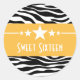 Trendy and moderno Stars Zebra Print Sweet Six Stickers apresentando um fundo de impressão em preto-e-branco e uma borda amarela ousada adornada com um divertido filme de estrela. Estes autocolantes são uma escolha de quadril e na moda para um doce 16. Fácil de personalizar, basta adicionar detalhes da parte nos campos de texto fornecidos. Clique em "Personalizar" para encontrar mais opções de personalização.
