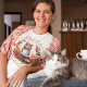 Um gatinho bonito com uma xícara de café e uma pilha de livros com o texto: Eu adoro gatos, livros e café. Para aqueles momentos em que você preferencialmente ficava em casa, lendo um bom livro, com seu gato no colo e uma xícara de café!