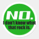 Esta folha de autocolante apresenta um logótipo verde com o texto "Não. Não sei o que é aquela rocha." Para aqueles que recebem pedidos demais para dar nomes a rochas misteriosas.