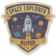 Este adesivo personalizado apresenta um emblema ousado e vibrante de explorador espacial. No centro do emblema está um foguete de desenho animado divertido voando pelo espaço com planetas orbitando ao seu redor.