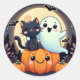 Uma ilustração brilhante do Dia das Bruxas, com um pequeno fantasma amigável e um sorridente gato negro descansando sobre uma alegre lanterna sob uma lua brilhante. A cena captura uma atmosfera lúdica e assustadora com morcegos cartunistas, olhos brilhantes na floresta escura e confortável, e uma vibração colorida e fofa geral. Perfeito para adicionar um toque encantador de diversão de Halloween, adequado para todas as idades.