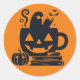 Fantasma de Halloween numa caneca de abóbora, com livros e morcegos.
