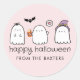 Adesivos de halloween cor-de-rosa apresentando uma trio de fantasmas amigáveis para todas as suas embalagens de guloseimas de halloween.