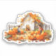 Um adesivo de queda com uma casa, crianças brincando, abóboras e folhas coloridas de outono.