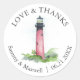 Estes adesivos de casamento de praia apresentam uma aquarela Júpiter, um farol da Flórida. Use os campos modelo para adicionar seu obrigado personalizado ao texto. Uma escolha encantadora de destino, costeira, náutica, favores e presentes de casamento à beira-mar. Arte de aquarela exclusiva de Victoria Grigaliunas do Do Tell A Belle.