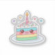 Design de impressão centralizado com uma ilustração plana kawaii de uma pequena fatia de bolo de arco-íris em um prato. O bolo tem um rosto sorridente com olhos grandes e bochechas rosadas, coberto com confeitos coloridos e uma pequena vela.