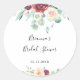 Este adesivo de favor de chuveiro de noiva floral de eucalipto contemporâneo é perfeito para um simples chuveiro de noiva. O design apresenta peônias encantadoras em roxo, rosa, bordo e burgundy em aquarela com folhas de eucalipto verdes, inspirando beleza artística.