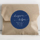 Este boneco de ressaca azul real e boho favorece o adesivo redondo clássico é perfeito para um casamento minimalista. O ousado design boêmico azul escuro e moderno apresenta uma caligrafia rústica simples com um estilo único, mas clássico. Personalize seus adesivos de favor com seus nomes e data de casamento.