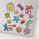 Etiquetas de folheto de verão. Cada autocolante tem a forma do objeto e inclui um sol, palmeiras, estrelas do mar / estrelas, conchas, chinelos, roda de um navio e óculos de sol. Designs brilhantes e coloridas são perfeitas para criar uma página de livros de recortes para um aniversário de verão ou uma festa de piscina. Os adesivos modelados também são divertidos em dar favores aos participantes da festa, ou usar para decorar envelopes e embalagens. As dimensões dos adesivos corresponderão ao tamanho da folha solicitada.