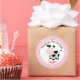 Etiquetas brancas com design de vaca (animal Fazenda) em fundo de bolinhas rosa.