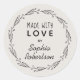 Personalizado Fabricado com Pau de Amor Rótulo de Produto Eggshell Neutral... Um adesivo na moda preto e redondo com casca de ovo para seus presentes feitos à mão, comidas caseiras ou produtos caseiros à venda. Uma coroa botânica de arte de linha borda o texto que lê "Made with Love by", seguido do seu nome na tipografia da escrita de tendências. Você pode facilmente mudar o nome para o seu próprio no modelo de personalização.