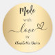 Um fundo de aparência dourada, texto preto. Personalize e adicione seu nome. Com o texto: Feita com amor, por + um pequeno coração.