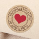 Adesivos com um coração vermelho e o texto "Feito à mão com amor" e nome personalizado em um fundo impresso com visual de papel Kraft. Use como selos de envelope, adesivos para presentes e brindes, embalagens de produtos, etc