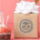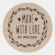 Um adesivo personalizado "feito com amor" em um fundo cor de kraft cercado por uma coroa de louros e corações. Faça-o seu adicionando seu próprio nome. Um bonito toque final para todos os presentes feitos à mão. Projetado para você pelo Blackberry Boulevard.