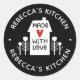 Um autocolante personalizado "feito com amor" com uma pequena casa fofa com um coração vermelho e as palavras, feito com amor em um fundo preto. Personalize adicionando seu próprio nome. Um toque final bonito para todos os seus presentes caseiros. Ótimo para presentes de Natal, ou para um negócio de panificação ou artesanato. Criado para você por Blackberry Boulevard.