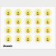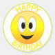 Grande rosto feliz amarelo redondo. Grandes olhos ovais abertos e um sorriso atrevido. Na parte superior, encontra-se a palavra "FELIZ" em texto amarelo curvo para baixo e na parte inferior encontra-se a palavra "BIRTHDAY" em texto amarelo curvo para cima.
