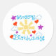 Um pequeno adesivo redondo Clássico de 1 1/2 polegada, folha de 20, papel branco brilhante, Com um Feliz Aniversário !, Desenho, Design, na frente dele, = ( Com o Sol e Nuvens, e Corações e Estrelas) = ( Desenho, Design, = por P.J.M.) = Com o Fundo Branco removido, = com um Fundo Branco adicionado.