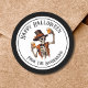 Dê alguns favoritos para festas adoráveis aos convidados numa festa anual de fantasia de Halloween, ou qualquer evento com este adesivo simples e divertido. Um simples aspecto preto e branco, que tem uma simples tipografia vírgula. Um esqueleto de bebendo com chapéu de cima e colete laranja lhe dá algum caráter. Descrito com círculos pretos. Bebendo pirata personalizado Skeleton de festa do Dia das Bruxas Feliz Adesivo redondo clássico