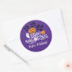 Legal, divertido e único adesivo do Halloween Provider para qualquer um. Com texto roxo personalizado Feliz Halloween e seu nome. Bolsas de orandeiro do Dia das Bruxas Laranja, fantasmas brancos e morcegos pretos. Divertimento bonito e um padrão meio assustador para crianças de todas as idades.