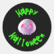 Um crânio 3d fofo com adesivo de olhos brilhantes e o texto "Feliz Halloween" para usar em presentes, cartões ou envelopes.