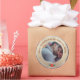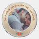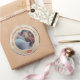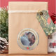 Esta etiqueta personalizada do adesivo fotográfico de Natal apresenta uma fotografia no centro que pode ser substituída por uma fotografia da sua própria família ou outra imagem personalizada. Uma amostra de saudação de Natal e nome da família são impressos no topo. Um quadro circular apresenta uma borda cintilante e brilhante de cintilação prateada fraca e um centro de folha de ouro. Uma poinsettia vermelha festiva é colocada no fundo.