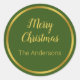 Este adesivo de Natal verde escuro diz que o Feliz Natal é um roteiro elegante. Texto adicional não-script está abaixo do script. Você pode editar o texto sem script para mostrar seu nome ou uma mensagem personalizada. A borda e o texto são dourados falsos (e não em folha).