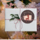 Um adesivo de Natal feliz com um veado bebê giro sobre um fundo com flocos de neve e uma forma estilizada em cores de terra quente na tendência para este Natal. Personalize com seus próprios detalhes e envie para seus entes queridos.