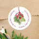 Esta design apresenta uma etiqueta de cor aquática de Natal com vinheta verde com uma elegante morango vermelho, folhas botânicas galhos de pinheiro de inverno, folhas de folha de folha folhada holly, letra de na moda, letra de estilo de bloco de tendência, selo de etiqueta circular com etiqueta adesiva redonda, etiqueta de presente criativa, adesivos de Natal personalizados, trabalho de arte de fita vermelha e verde, simples celebração festiva elegante