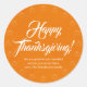 Texto personalizado de Ação de Graças feliz e nome elegante favorece os Classic Round Stickers. Uma tipografia elegante de caligrafia rodeada por uma delicada coroa redonda de abóboras bonitinhas. Texto branco totalmente personalizável sobre o fundo do papel kraft de cor laranja-abóbora. Excelente como etiquetas de presentes para presentes e favores personalizados.