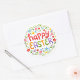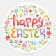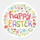 Texto de felz pascoa com flores coloridas e folhas verdes formando um círculo sobre fundo colorido, tema de feriado primavera, cores vibrantes, design alegre.
