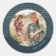 Este belo adesivo azul de inverno apresenta uma foto circular central com estrutura, e uma simples tipografia de Natal Feliz. Este adesivo de tendência também apresenta um padrão geométrico azul metálico esfarrapado, listrado, e um fundo azul escuro. Por favor veja esta coleção festiva sazonal para opções de cores adicionais e coordenando cartões de Natal.