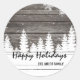 Uma festa de Natal original, rústica, ou um adesivo da festa de Natal com madeira castanha vintage com neve branca, flocos de neve, pinheiros e floresta. Perfeito para o Natal do país e do tema rústico
