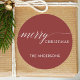 Um adesivo vermelho de férias moderno com as palavras "Feliz Natal". Personalizou isto adicionando seu próprio texto.