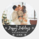 Rustic Chalkboard Snowflakes "Feliz Feriados" Calliografia Script Family Foto Feriado de Natal, Sticker Round. Apresenta o nome da família e o ano, flocos de neve fofos (neve) no quadro negro ou fundo de quadro negro. Excelente para acessórios de correspondência Envelope selos e adesivos para presentes.