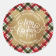 Feliz Natal em letras brancas em chic num esplash de folha de ouro falsa, estes adesivos redondos são personalizados com Férias Doces e o seu nome familiar em letra chic num padrão de xadrez de feriado. A combinar placas de papel, guardanapos e MAIS designs na nossa loja.