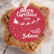 Mostre o quanto você acredita na magia do Natal e do Papai Noel com este adesivo redondo da família de Natal com a silhueta de Papais noeis de trenó em branco com suas renas, voando em uma trilha de estrelas. A legenda no topo lê Feliz Natal em letras brancas manuscritas. O texto é facilmente personalizável com seus desejos, ano e nome da família ou nome comercial. Este adesivo faz o perfeito selo de Natal para desejos familiares ou pode ser usado para decorar seus presentes de Natal