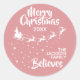 Mostre o quanto você acredita na magia do Natal e do Papai Noel com este adesivo branco e roxo da família de Natal rosa com a silhueta de Papais noeis de branco com suas renas, voando em uma trilha de estrelas. A legenda no topo lê Feliz Natal em letras brancas manuscritas. O texto é facilmente personalizável com seus desejos, ano e nome da família ou nome comercial. Este adesivo faz o perfeito selo de Natal para desejos familiares ou pode ser usado para decorar seus presentes de Natal