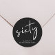 Etiquetas pretas para os seus 60º convites de festas de aniversários, favoritos para festas, cartas de agradecimento, etc., com "sessenta" mostrados em um grande roteiro branco.