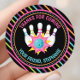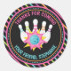 Festa de Aniversário de Boliche Neon Arco-íris Obrigado Adesivo Redondo Clássico. Este design apresenta pinos de boliche, uma bola de boliche e estrelas. Cores neon do arco-íris brilhantes realmente se destacam contra o fundo preto. Personalize este design de convite personalizado com os detalhes da sua festa.