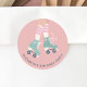 Vinheta-festa de aniversário de patinagem cor-de-rosa pastel divertida com uma ilustração retroinspirada de skates de roletas em uma garota vestindo meias de tubos riscados rosa. Adicione o nome dela à tipografia azul-lacre escura.