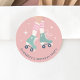 Etiqueta de festa de aniversário para patinagem com rolo roliço-branco, com uma ilustração retrorinspirada de skates roletas numa rapariga que veste meias de tubos riscados-rosa. Adicione o nome dela à tipografia azul-lacre escura.