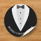 Adesivo de festa de despedida de solteiro com terno preto e gravata borboleta. Personalize com o nome do noivo.