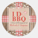 Este design de estilo rústico apresenta um fundo de madeira com fita vermelha e branca. Sobre isso, há uma textura de aniagem com fonte serifada vermelha e preta e escrita à mão que é totalmente personalizável para o seu evento, seja uma festa de noivado ou chá de casal. Celebre com estilo com este design de adesivo!