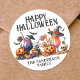 Autocolante de Halloween. Celebre a estação com este adesivo redondo festivo com o trabalho de arte no centro. "Feliz Dia das Bruxas" é exibido no topo em fontes divertidas e assustadoras, enquanto no fundo há um espaço personalizável para seu nome ou mensagem. O design combina tons pretos, laranja e brancos para uma vibração clássica do Halloween, com detalhes sutis de grunge para charme extra. Perfeito para favoritos para festas, etiquetas de presentes ou decoração para uma reunião de Halloween. Totalmente personalizável e divertido para todas as idades.