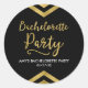 Este adesivo redondo elegante apresenta um giz geométrico e a palavra "Festa de solteira" em dourado falso contra fundo preto. Confira os convites e itens correspondentes aqui http://www.zazzle.com/collections/modern_faux_gold_chevron_celebration_collection-119531050277382712?rf=238364477188679314 Personalize-o com seus detalhes substituindo o texto do marcador de posição. Para obter mais opções, clique no botão "Personalizar". *Observe que a Marca d'água do Zazzle que aparece na visualização de zoom NÃO aparecerá no produto impresso final. © Rosewood e Citrus