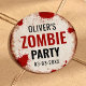 Adesivo redondo de aparência vintage para uma festa temática de surto de zumbis, com uma placa desgastada e manchas de sangue.