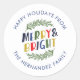 Este adesivo de Natal moderno e fofo apresenta uma tipografia caprichosa que diz Merry and Bright com uma moldura de guirlanda de galhos em cores tradicionais. Personalize com sua própria mensagem de Natal e o nome da família para usar como selos de envelope ou etiquetas de embrulho de presente. Use as ferramentas de design para personalizar as fontes e cores ou faça o upload de suas próprias fotos.