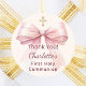 A soft ivory colored background. Decorated with a large pink bow and a golden cross. Personalize and add the name. Text: Thank you!