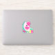 Um decal de vinilo com uma ilustração fofinha de um flamingo cor-de-rosa com algumas melancias e ananases. Esquema de cor rosa e verde. Sumério e tropical.