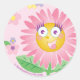 Um doce adesivo de flor antropomórfico — flor rosa em fundo rosa.